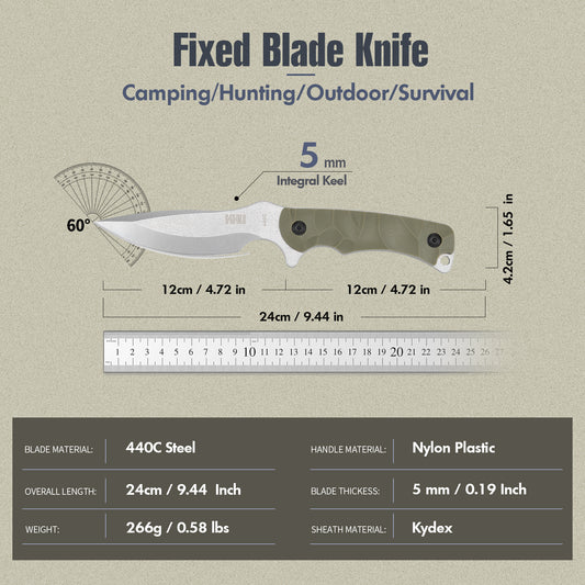 KHU Cuchillo Hoja Fija, Cuchillo Supervivencia Cuchillo Caza Cuchillo Bushcraft 420HC Acero Mango de Nylon Plástico, Outdoor Caza Camping Accesorios - Funda Kydex